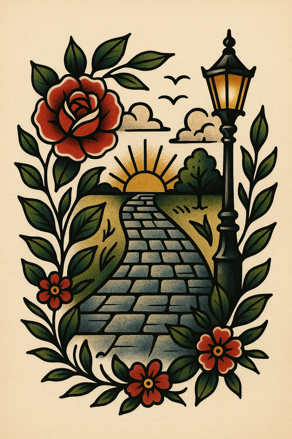 /Collection: /by davooda/Type: PNG/This image features a vibrant, illustrated landscape, showcasing a path leading to a sunrise, framed by decorative flowers and a streetlamp. It has a classic tattoo art style, ideal for art enthusiasts and tattoo designs.
