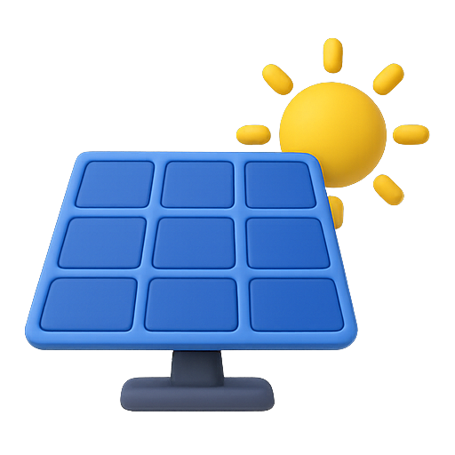 Colorful 3D illustration depicting a solar panel next to a sun icon, ideal for renewable energy themes, educational materials, and eco-friendly content.