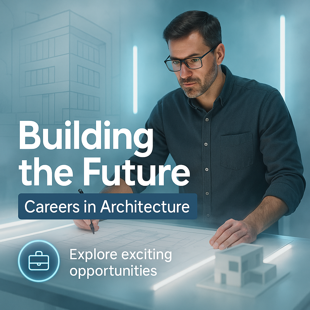 /Collection: /by davooda/Type: PNG/A visually engaging promotional image highlighting careers in architecture, featuring a professional working on design plans in a modern setting. Ideal for recruitment and educational campaigns.