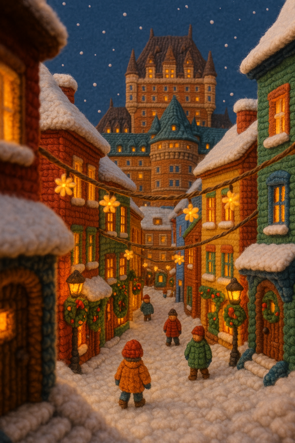 A picturesque winter scene of Old Quebec, featuring vibrant wool-like buildings, snow, and small figures enjoying the festive atmosphere. The scene captures a cozy holiday vibe with soft colors.
