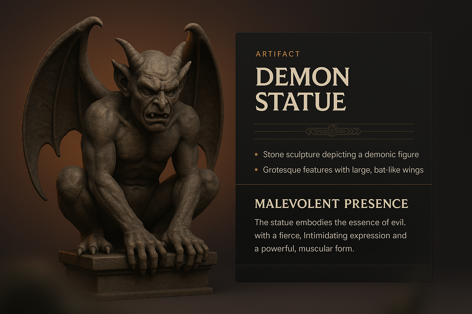 A detailed stone sculpture of a demon with grotesque features and large bat-like wings, showcasing a powerful and intimidating presence.