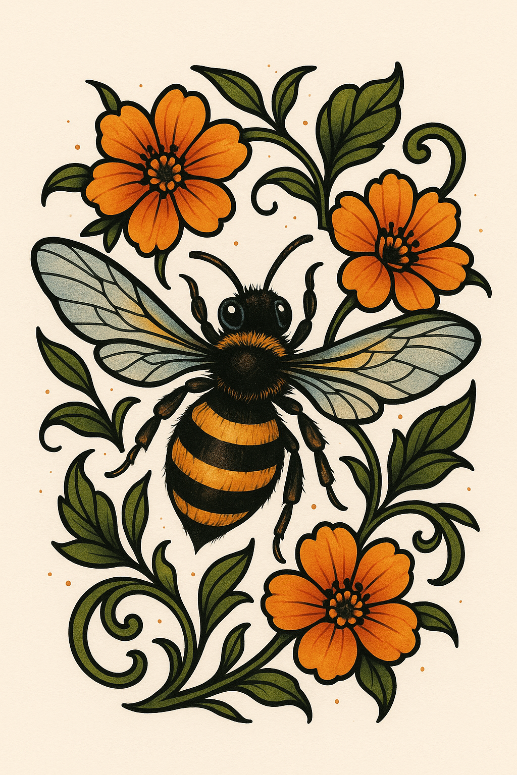 /Collection: /by davooda/Type: PNG/A beautifully illustrated artwork featuring a bee surrounded by vibrant orange flowers and green foliage. This design blends nature and art, suitable for educational, decorative, or environmental themes.