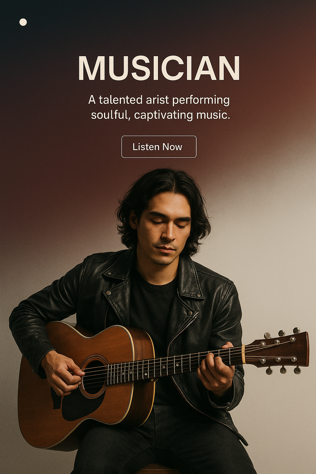 A musician in a leather jacket plays an acoustic guitar, showcasing his talent. The background features a gradient from dark to light, enhancing the visual appeal.
