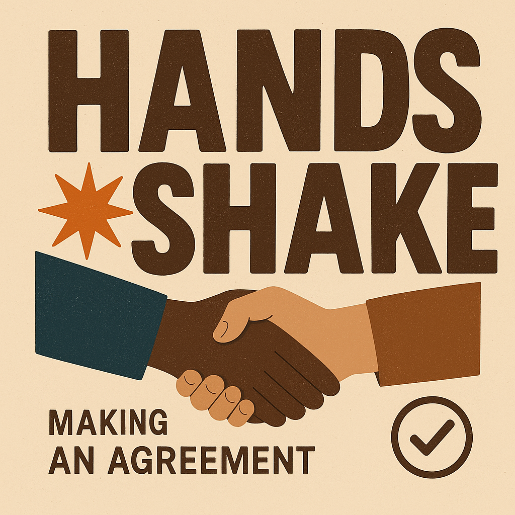 /Collection: /by davooda/Type: PNG/A stylized graphic featuring a handshake to symbolize making an agreement, designed with bold typography and warm colors, suitable for business or educational contexts.