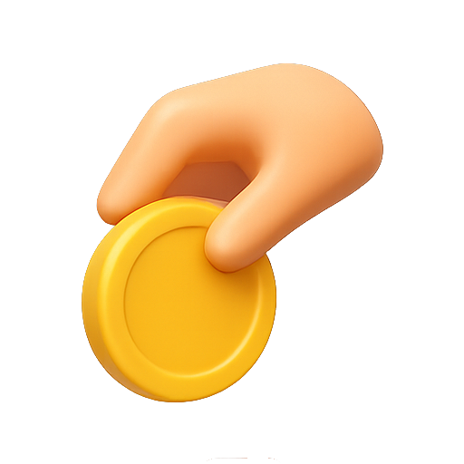 Stylized 3D illustration of a hand holding a yellow coin, suitable for financial or gaming applications, with a modern and playful design aesthetic.