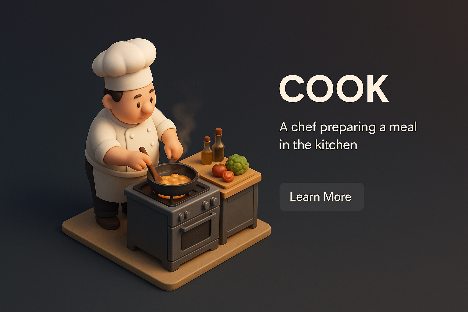 A detailed 3D scene featuring a chef cooking a meal, surrounded by kitchen elements. The background is dark, enhancing the vibrant colors of the scene, with a clear call-to-action button.