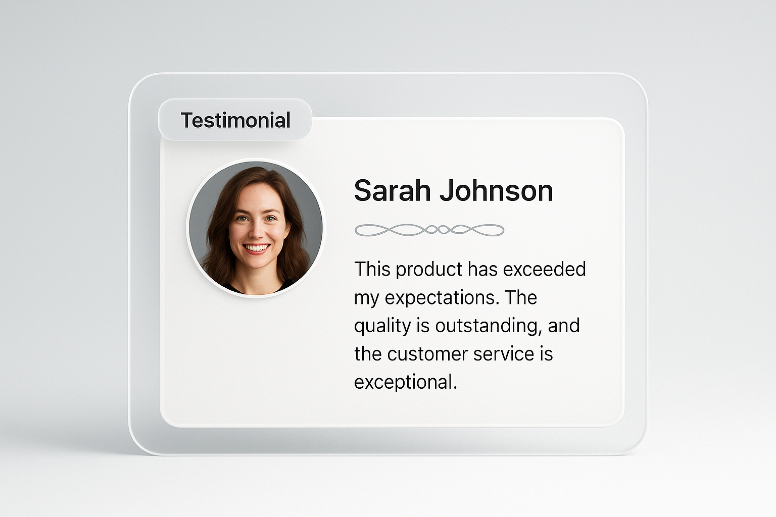 A modern testimonial card featuring a circular photo of a smiling woman, her name, and a positive review text. The design includes a sleek, layered structure with a gradient background and transparent elements.