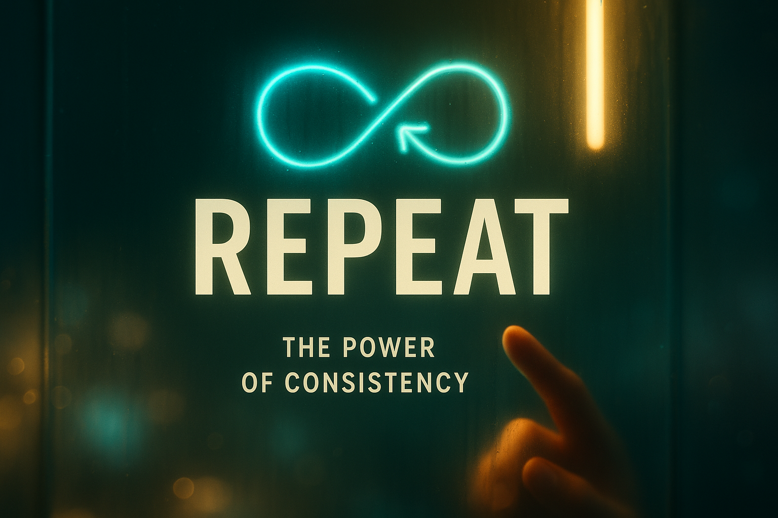 An artistic representation featuring neon lights and translucent glass, conveying the theme of consistency with the word 'REPEAT' prominently displayed. The soft glow creates an engaging atmosphere.