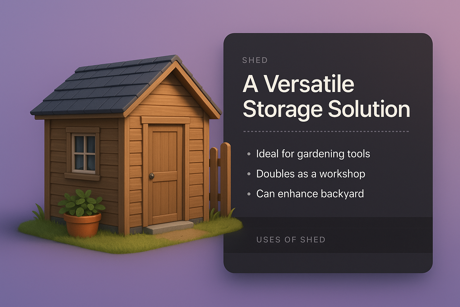 A visually appealing 3D illustration of a garden shed, featuring a dark panel design with informative text blocks. The shed is surrounded by subtle elements enhancing depth.