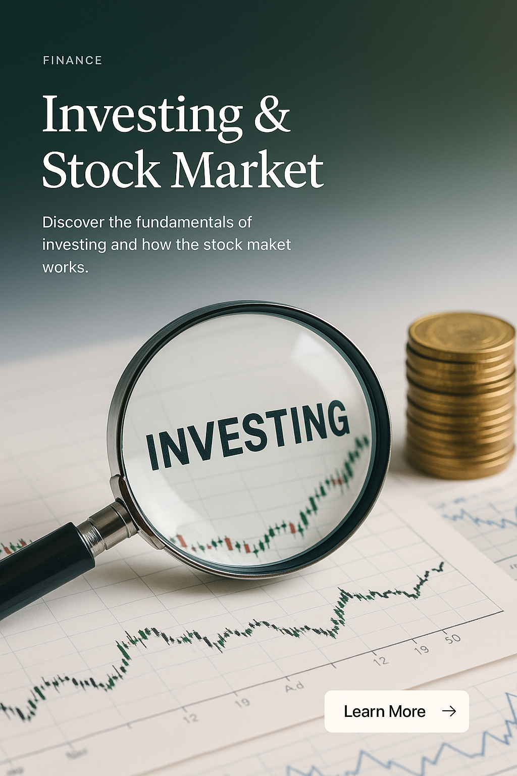 A magnifying glass focuses on the word 'INVESTING' over financial charts and coins, illustrating the exploration of investing and stock market fundamentals.