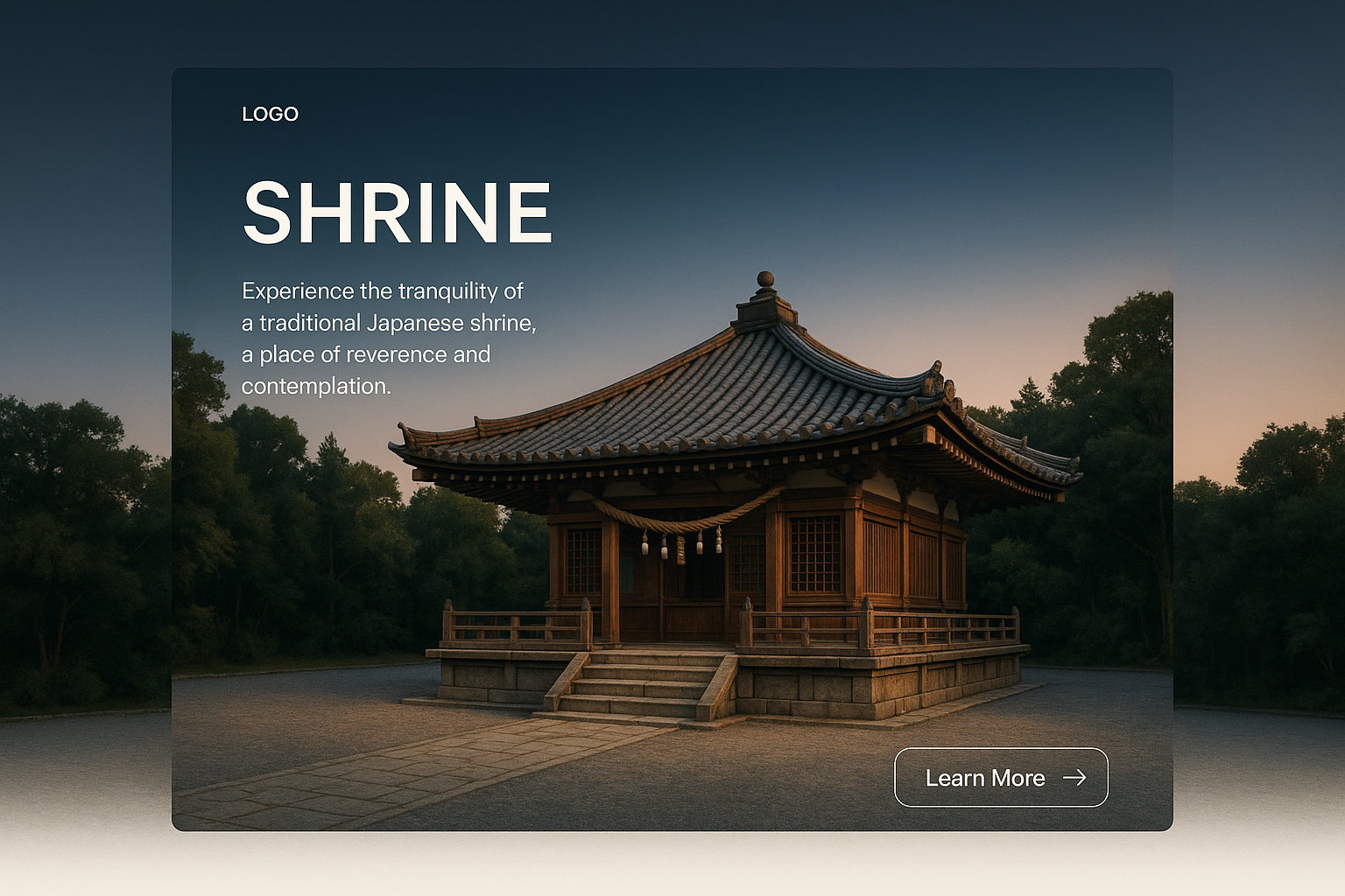 A beautifully illustrated Japanese shrine, capturing its serene ambiance. The design features a gradient background, highlighting the shrine's architectural elegance and inviting atmosphere.