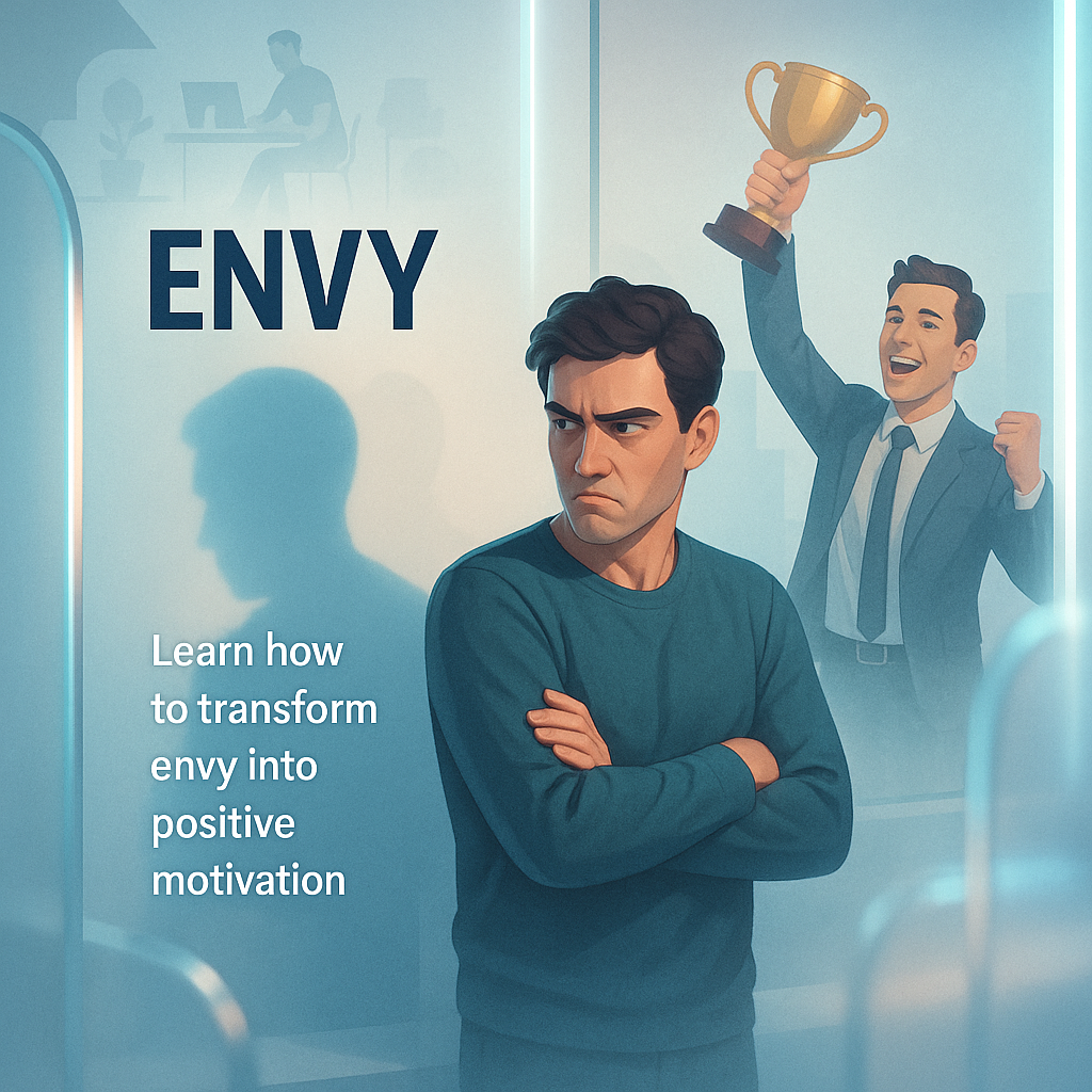 /Collection: /by davooda/Type: PNG/A conceptual illustration depicting the theme of envy transformed into positive motivation. The design features contrasting emotions, ideal for personal development content.