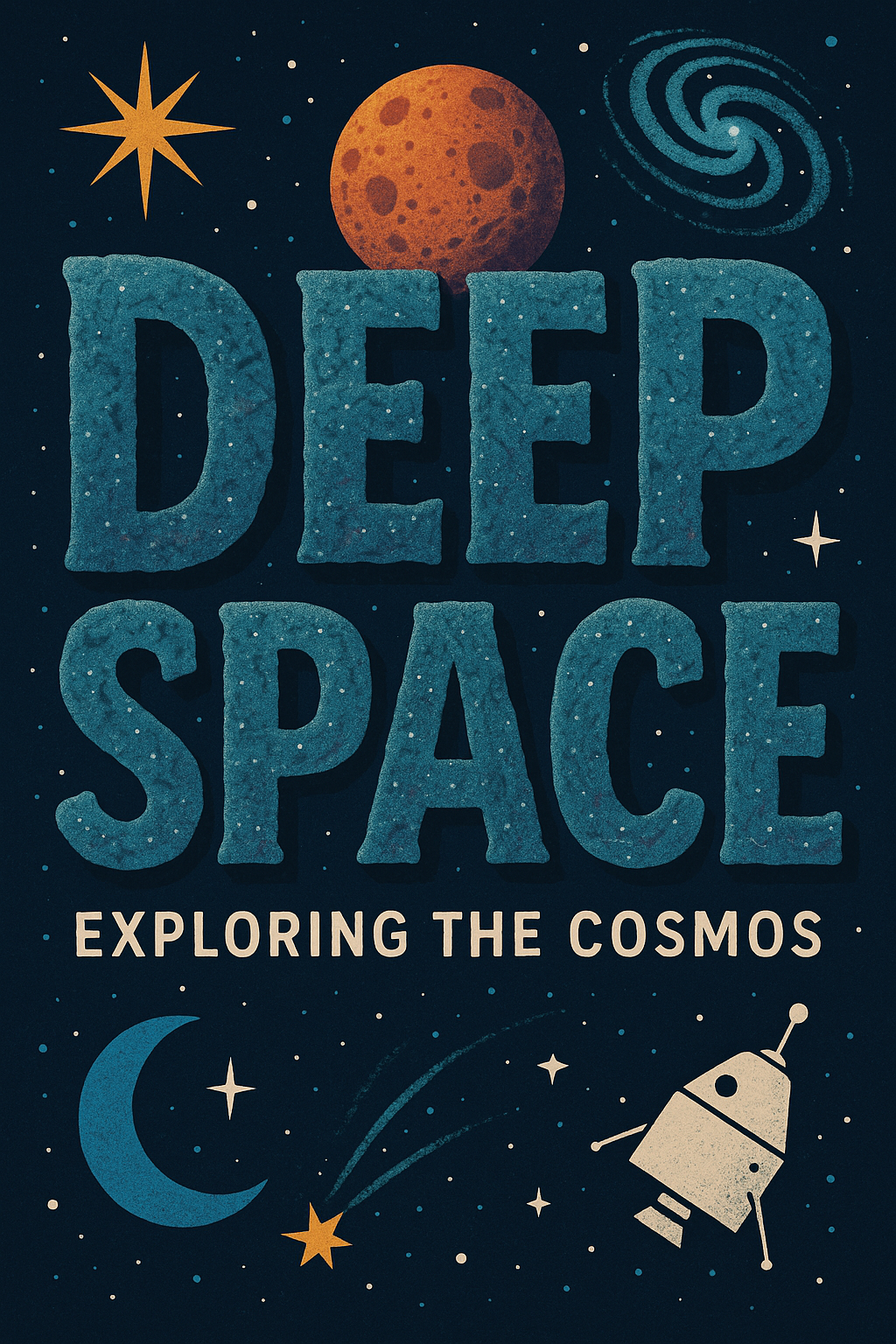 A visually engaging poster themed around space exploration, featuring playful typography and cosmic elements like planets, stars, and a rocket. Ideal for educational or creative contexts.