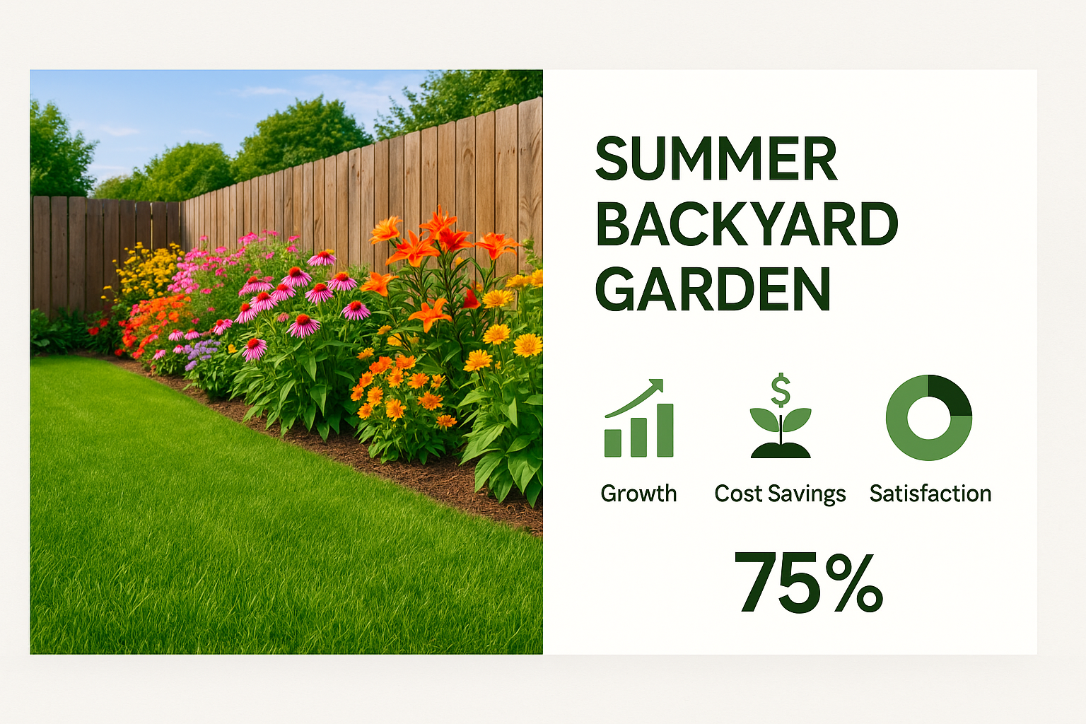 Vibrant promotional graphic showcasing a summer backyard garden with flowers, emphasizing growth, cost savings, and satisfaction. Ideal for gardening or landscaping marketing.