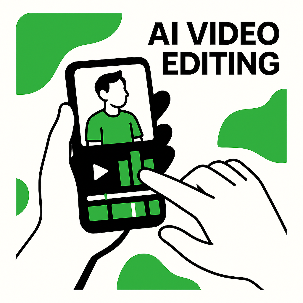 /Collection: /by davooda/Type: PNG/A modern, minimalist graphic depicting hands using a mobile device for video editing, emphasizing AI technology in a playful style. Ideal for tech-related content.
