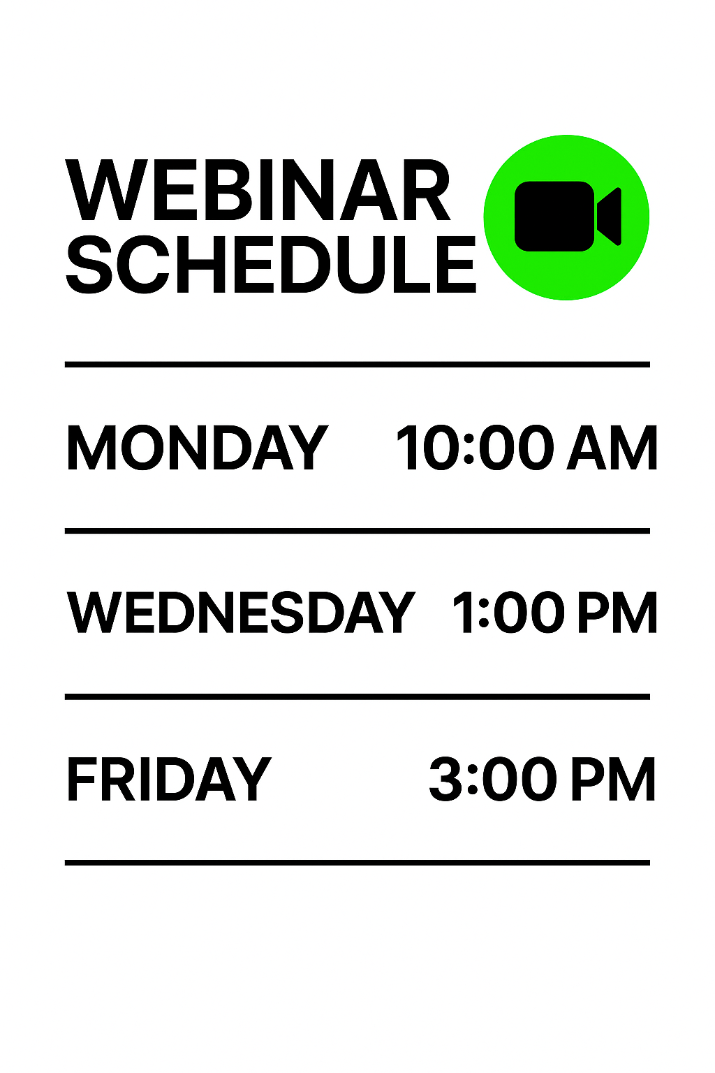 Simple and modern infographic presenting a schedule for upcoming webinars with clear time slots, ideal for online event promotion.