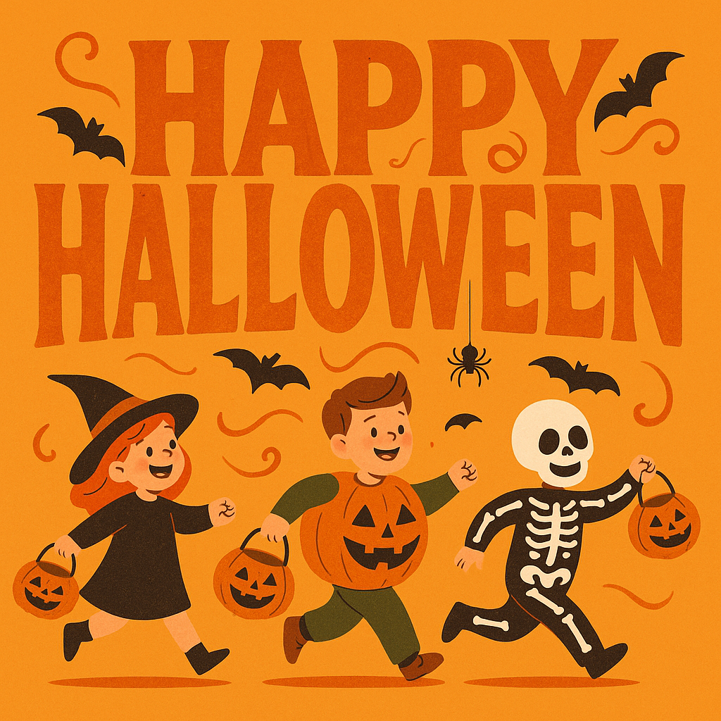 /Collection: /by davooda/Type: PNG/A vibrant Halloween-themed illustration showcasing children dressed in costumes carrying pumpkins. Ideal for seasonal promotions and festive decorations.