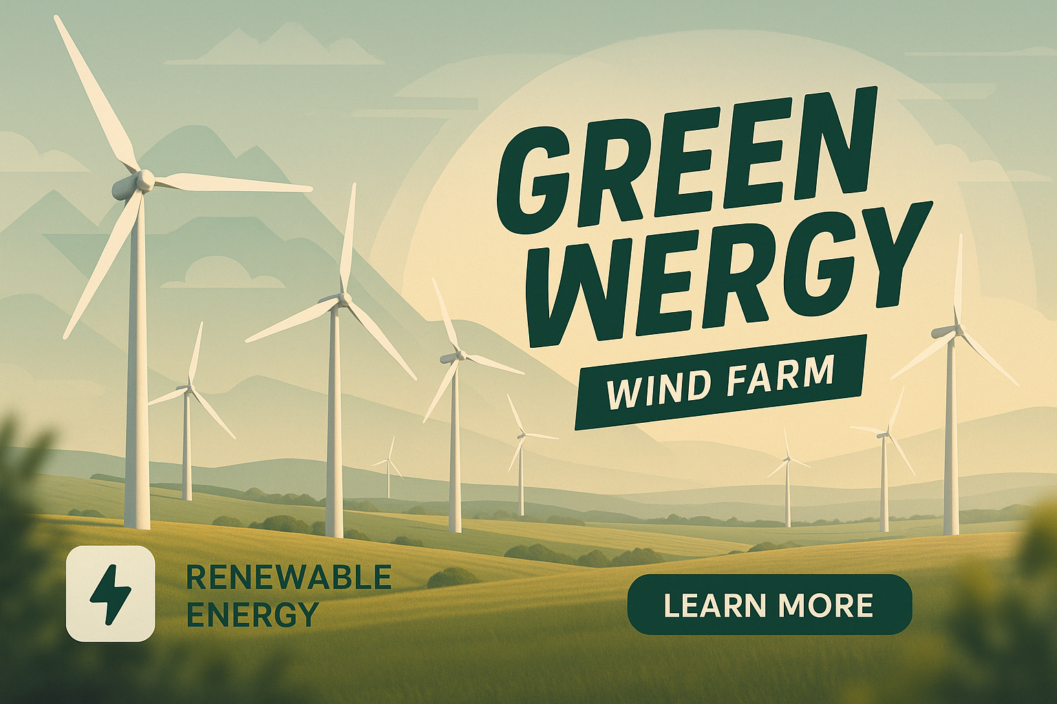 /Collection: /by davooda/Type: PNG/A vibrant promotional banner showcasing a wind farm with a serene landscape. Ideal for renewable energy campaigns, featuring modern design elements and a clear call-to-action.