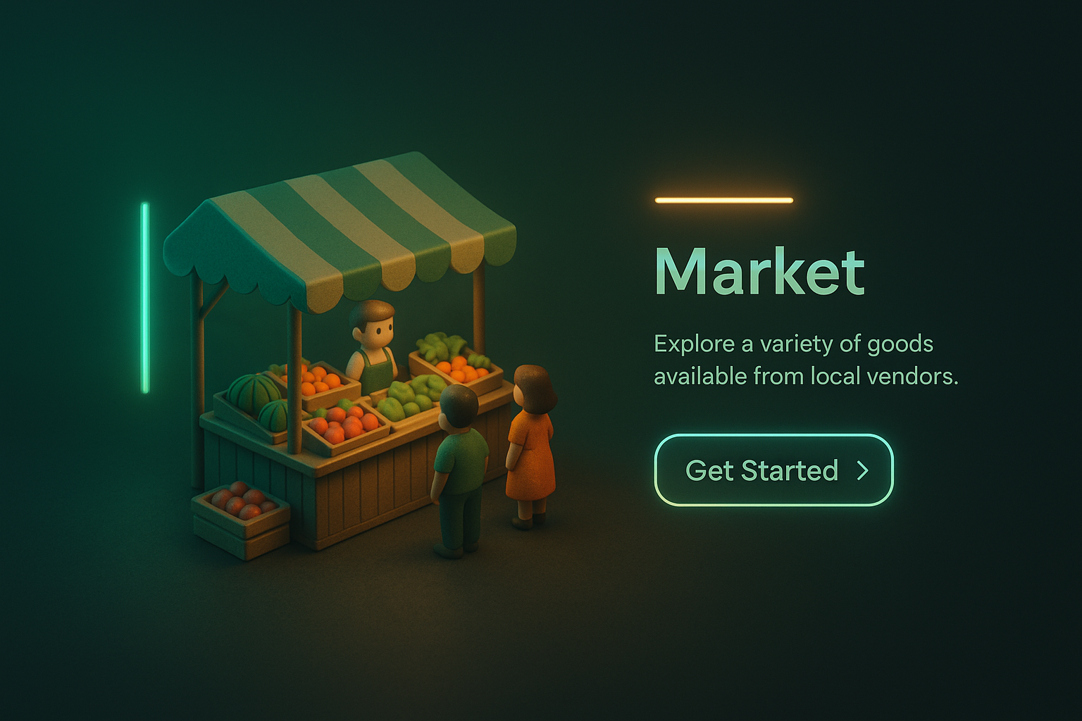 /Collection: /by davooda/Type: PNG/A detailed 3D scene depicting a market stall with neon accents, featuring characters interacting with the vendor. The dark background enhances the vibrant colors.