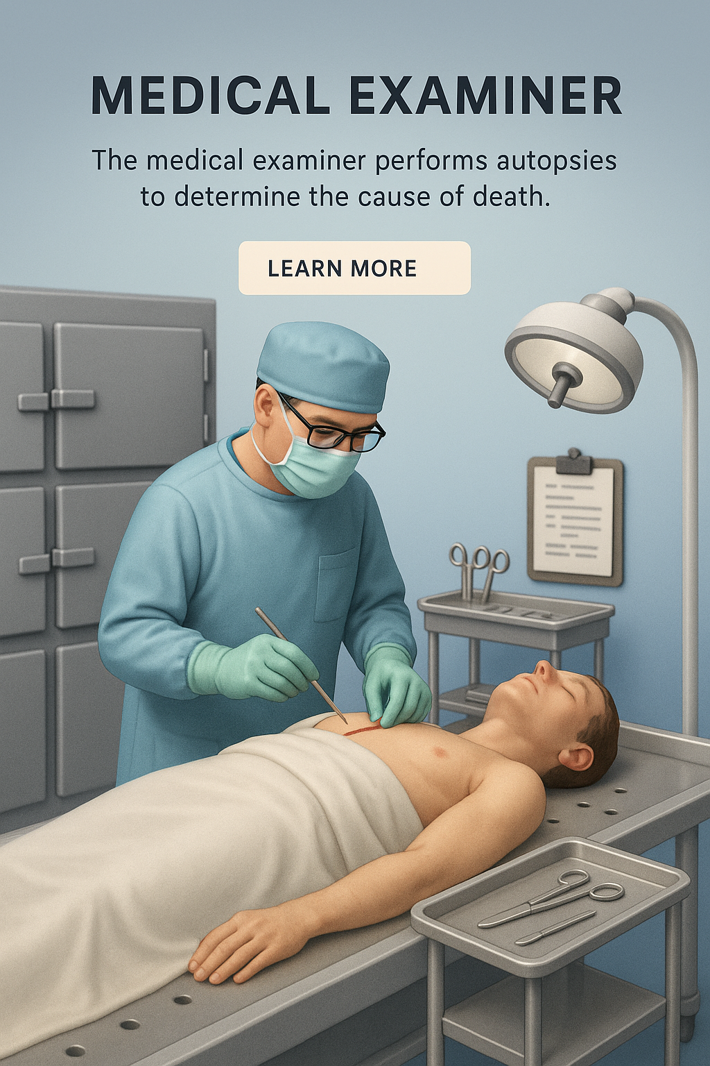 /Collection: /by davooda/Type: PNG/A detailed 3D illustration of a medical examiner conducting an autopsy. The scene is zoomed out, showcasing the entire setup with minimal text elements and a clean, cohesive design.