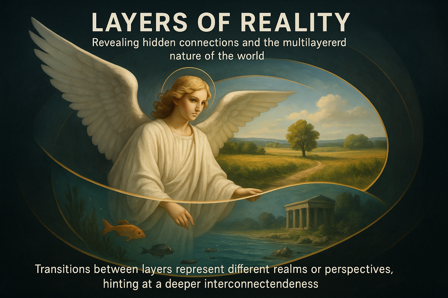 /Collection: /by davooda/Type: PNG/An artistic depiction of the multilayered nature of reality featuring an angel amidst concentric layers, symbolizing transitions between different realms and perspectives.