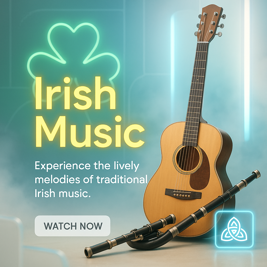 /Collection: /by davooda/Type: PNG/Engaging promotional image featuring a guitar and a traditional Irish instrument, designed to attract music lovers to a cultural experience. Ideal for digital marketing.