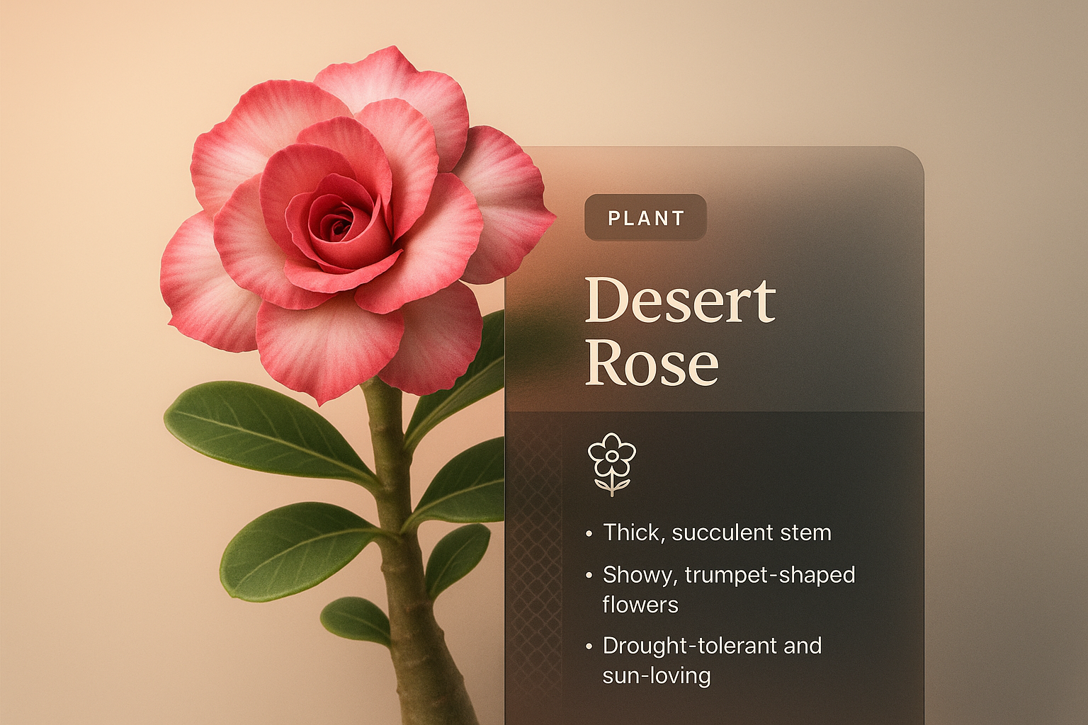 /Collection: /by davooda/Type: PNG/A visually captivating 3D illustration of a Desert Rose flower, accompanied by a stylish, informative overlay. The design features a gradient background and clear text integration.