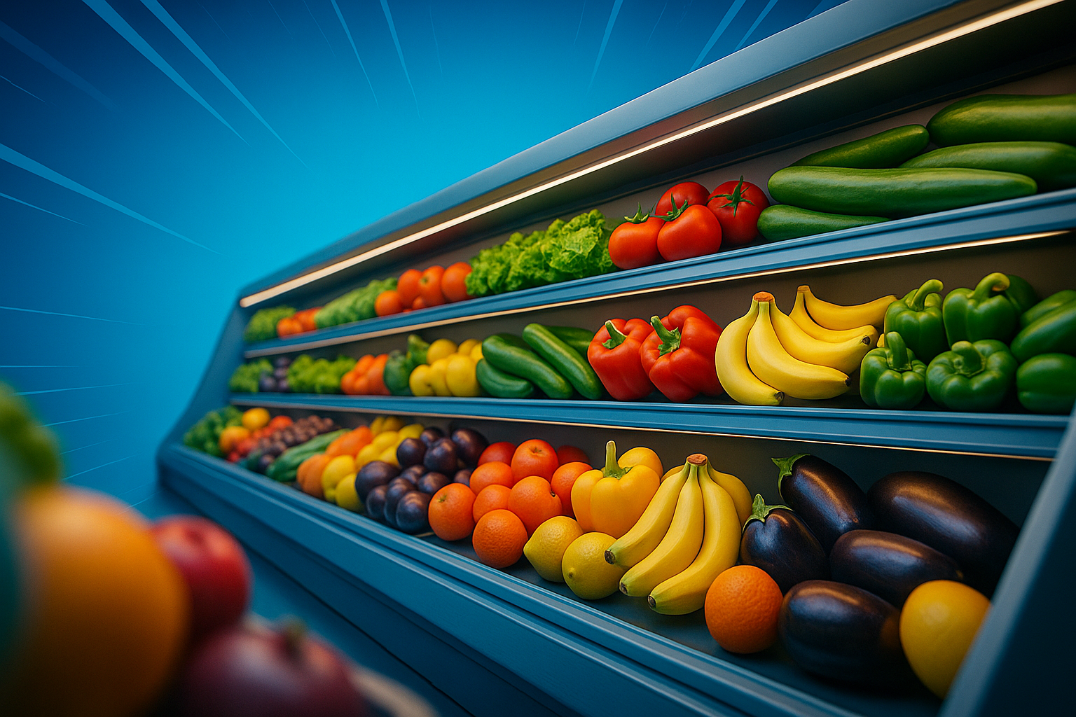 Vibrant Display of Fruits and Vegetables in Supermarket Fridge