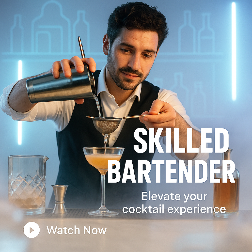 /Collection: /by davooda/Type: PNG/Dynamic social media post featuring a skilled bartender crafting cocktails, ideal for promoting mixology classes or cocktail-related content. The modern bar background enhances the professional feel.