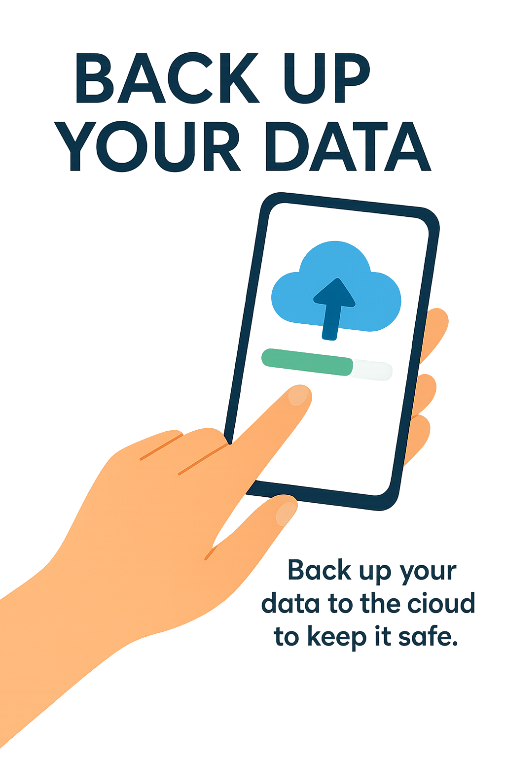 Informative graphic illustrating the concept of backing up data to the cloud, featuring a hand interacting with a smartphone. Ideal for tech-related content and user education.