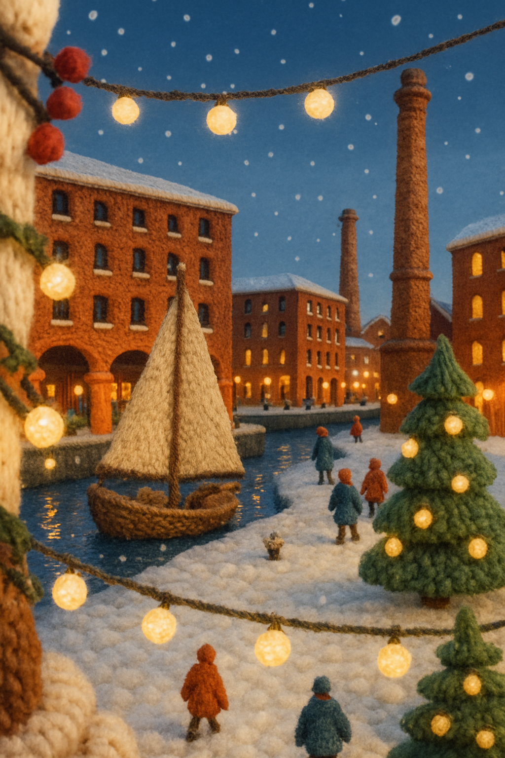 A whimsical 3D depiction of Albert Dock in Liverpool, crafted to resemble woolen yarn. The scene features a snow-covered waterfront, colorful lights, and tiny figures enjoying the festive atmosphere.