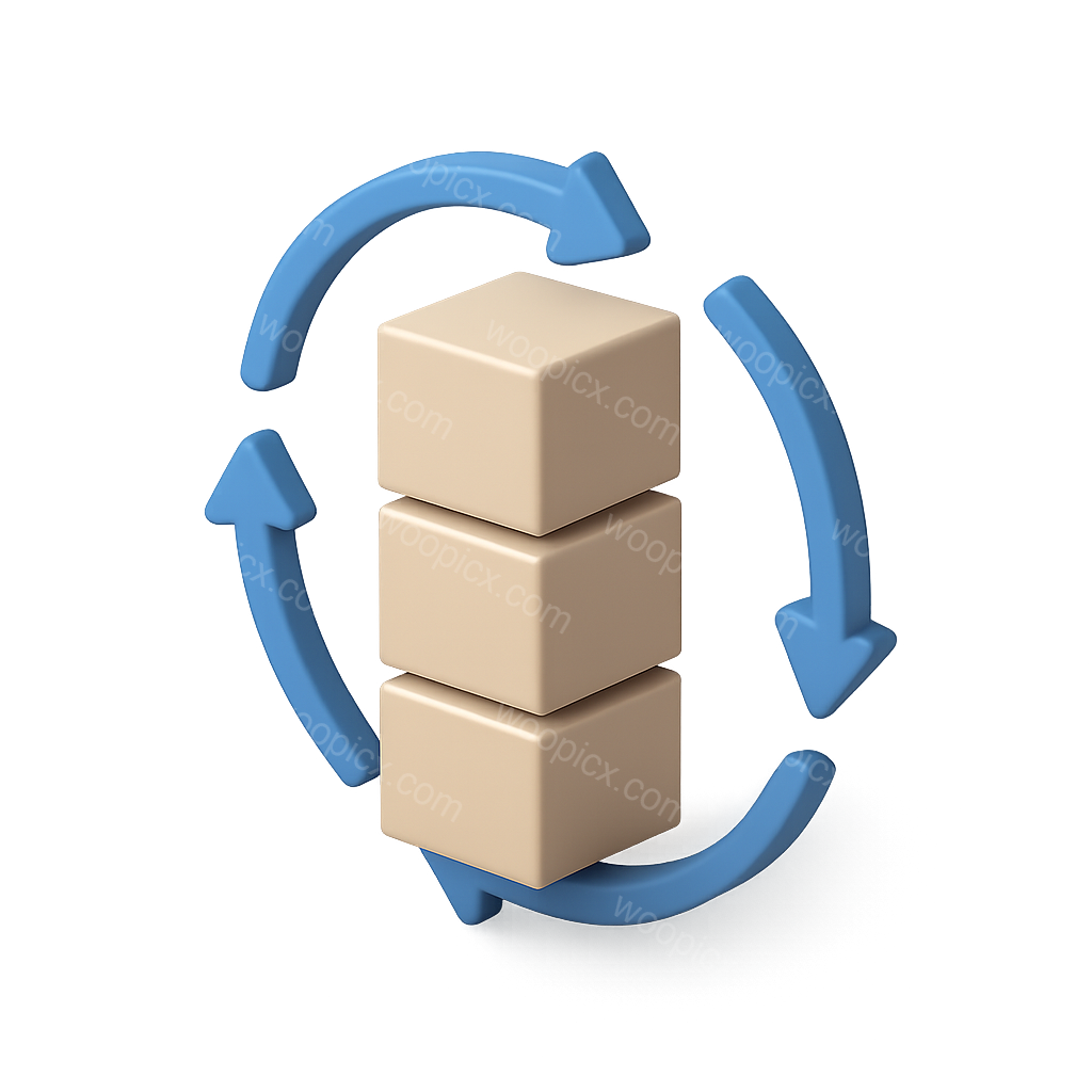 Collection: /by davooda/Type: PNG/3D Stacked Cubes Icon with Arrows Illustration/An isometric illustration of three stacked cubes surrounded by circular arrows, giving a 3D effect. The cubes are light-colored and the arrows are blue, set against a subtle gradient background.