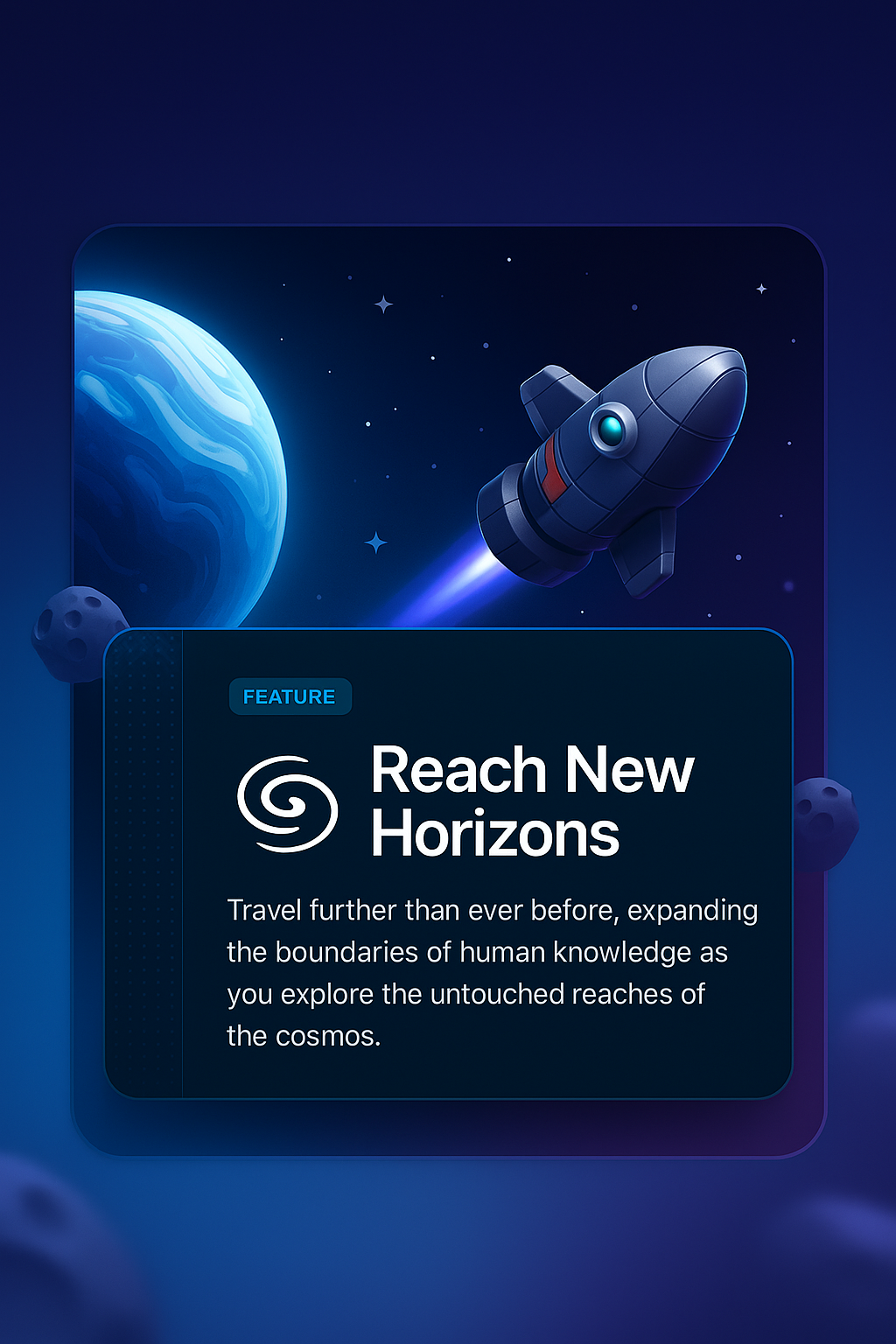 /Collection: /by davooda/Type: PNG/A captivating 3D illustration of a rocket soaring through deep space, with a vibrant planet in the background. The design integrates a feature block with a clear title and descriptive text.