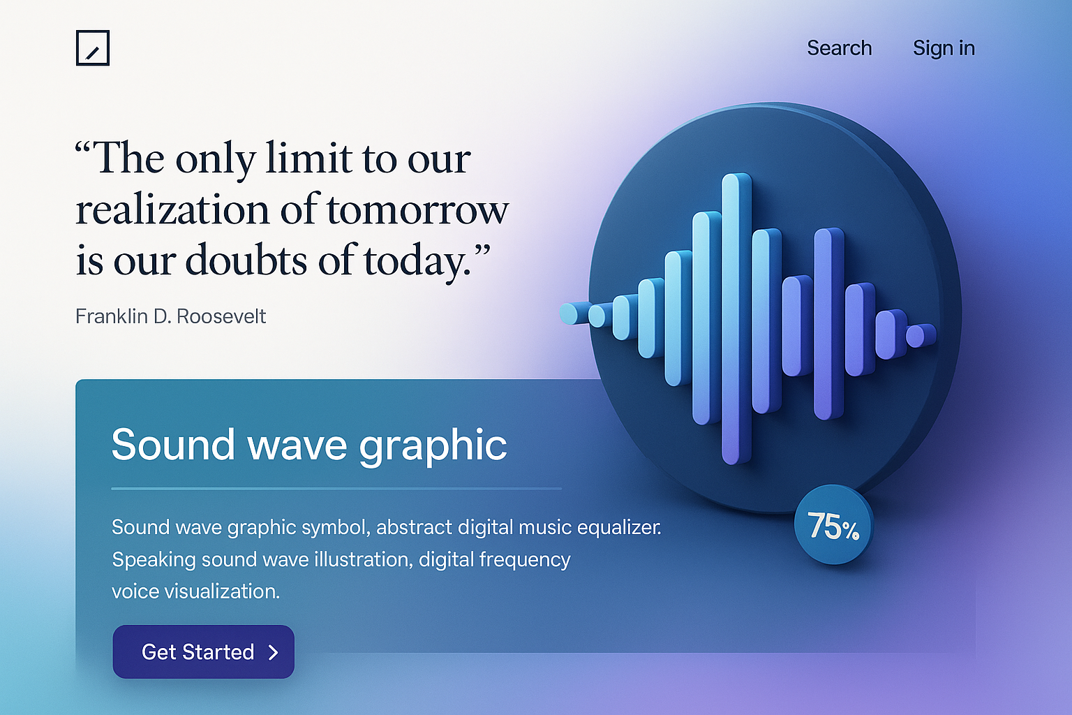 A visually striking 3D landing page design featuring a sound wave graphic, a quote block, and an action button. The layout incorporates a smooth gradient background and layered elements for depth.