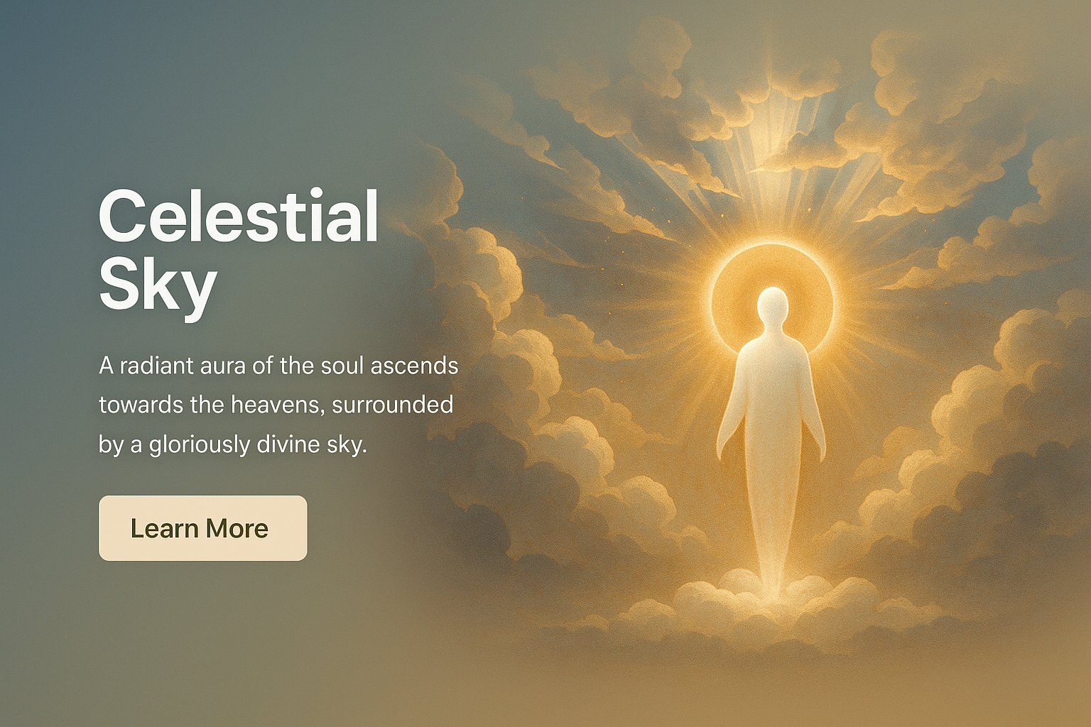 A serene 3D illustration depicting a radiant aura of the soul ascending towards a divine sky, framed by soft clouds and warm light. The composition includes a minimalistic text block and action button.