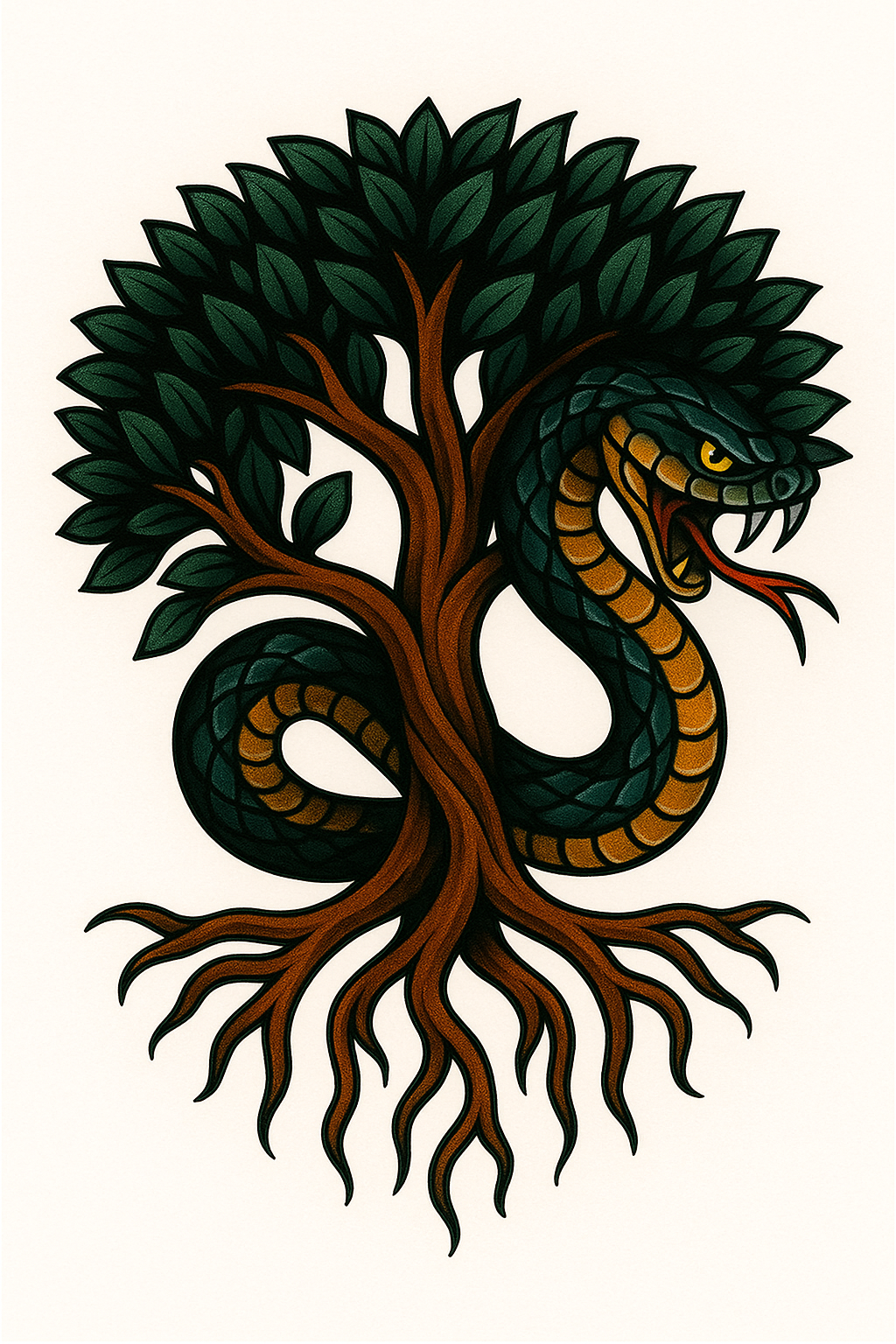 /Collection: /by davooda/Type: PNG/This is a vibrant illustration combining a tree and a snake, characterized by bold lines and a color palette of greens and browns. It serves as decorative art, appealing to nature and wildlife enthusiasts.