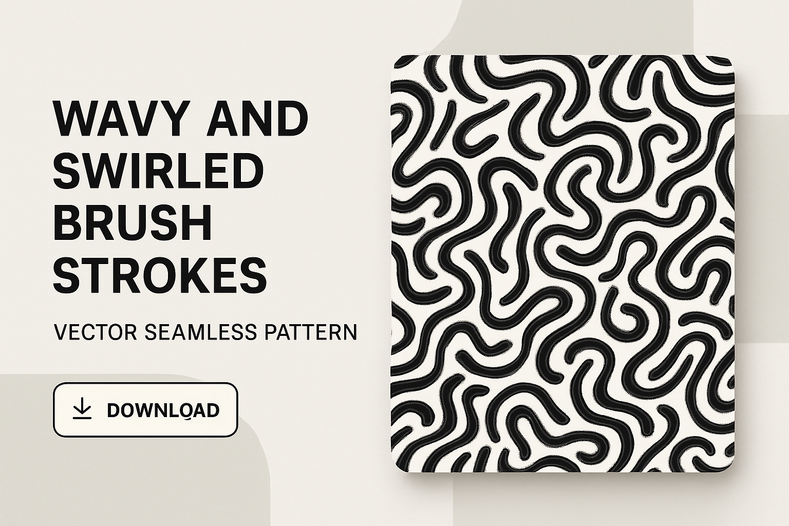 A modern black and white seamless pattern featuring wavy and swirled brush strokes. The design includes bold curved lines, accompanied by clear typography and a call-to-action.