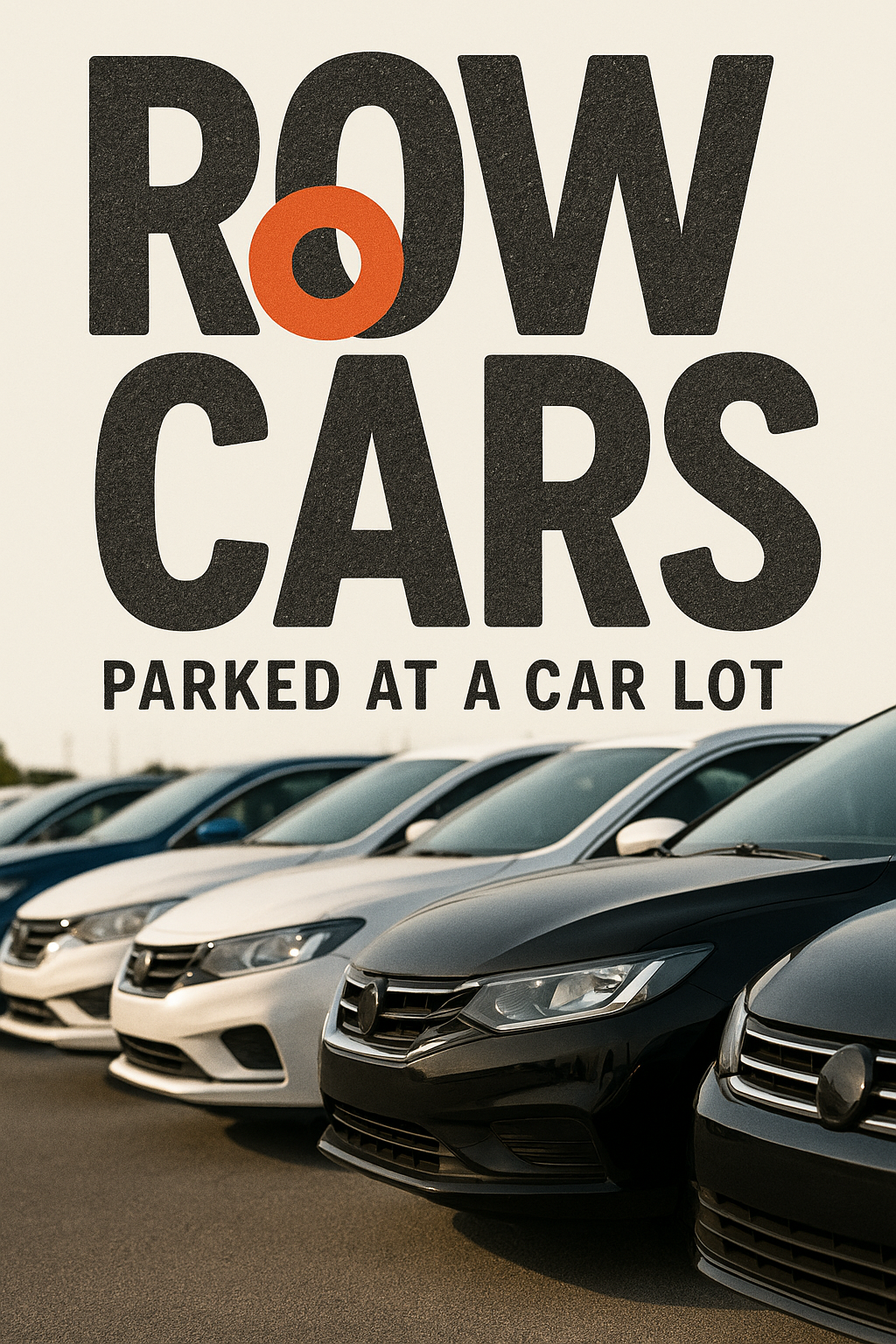 Stylized image showcasing a row of parked cars in a car lot with bold typography. Ideal for automotive marketing or dealership promotions.
