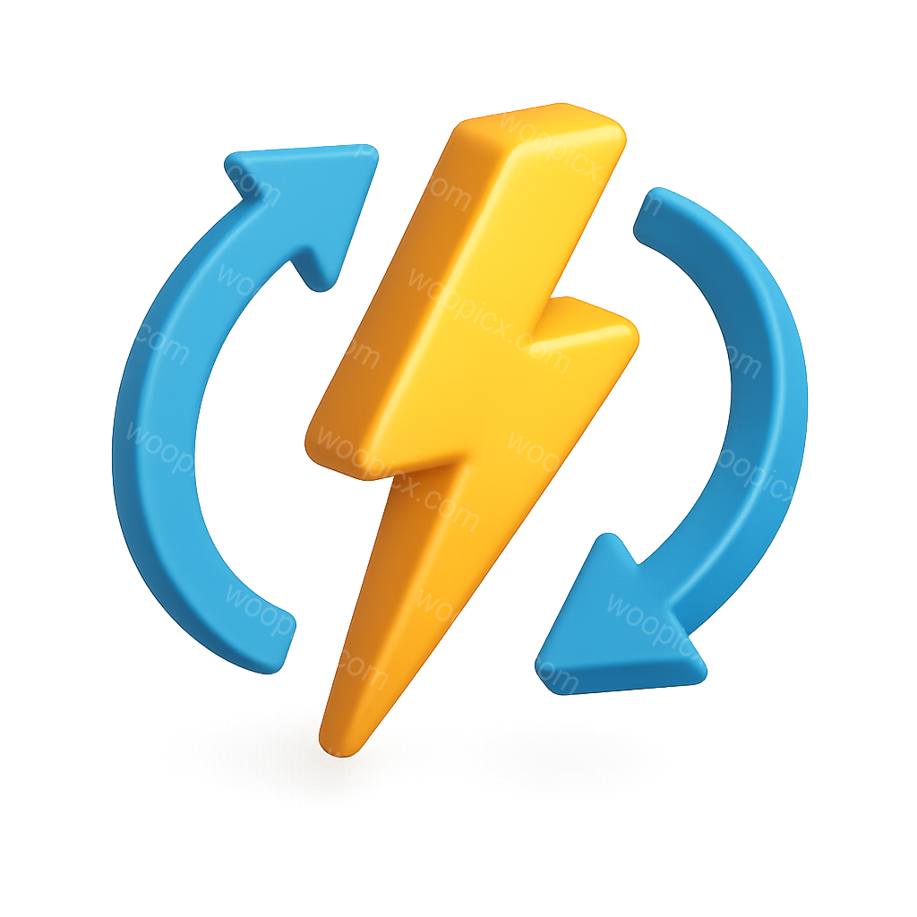 A vibrant 3D icon featuring a stylized lightning bolt surrounded by circular arrows, designed with a transparent background and isometric perspective.