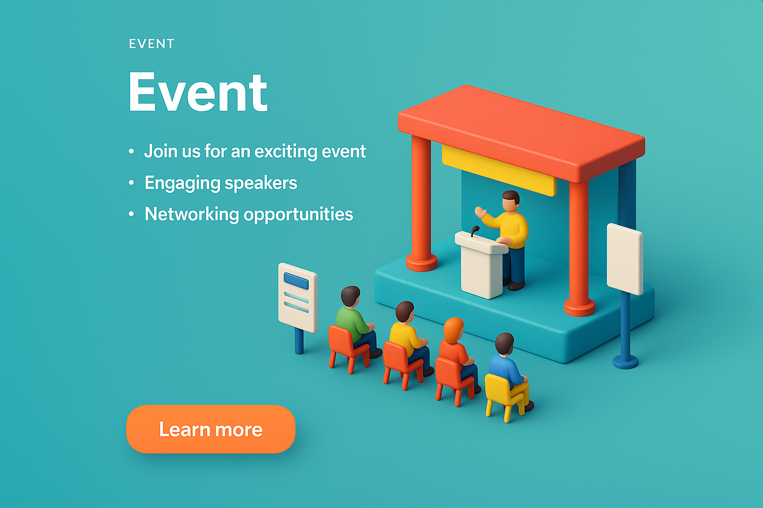 A zoomed-out 3D illustration depicting a small event scene. Colorful elements include a speaker at a podium and an audience seated, creating a vibrant atmosphere. Text and buttons are clear and readable.