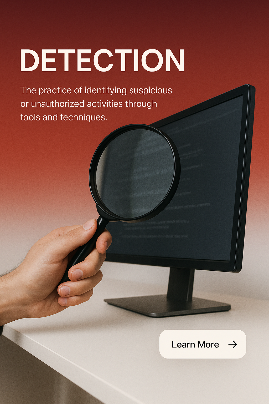 /Collection: /by davooda/Type: PNG/A hand holding a magnifying glass focuses on a computer screen displaying code. The background features a gradient from dark to light, enhancing the detection theme. A 'Learn More' button invites interaction.