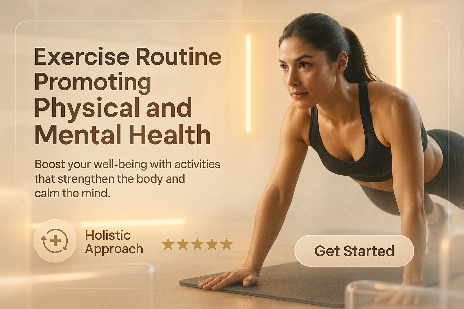Engaging graphic promoting a holistic exercise routine for physical and mental health. Ideal for wellness campaigns and fitness-related content.