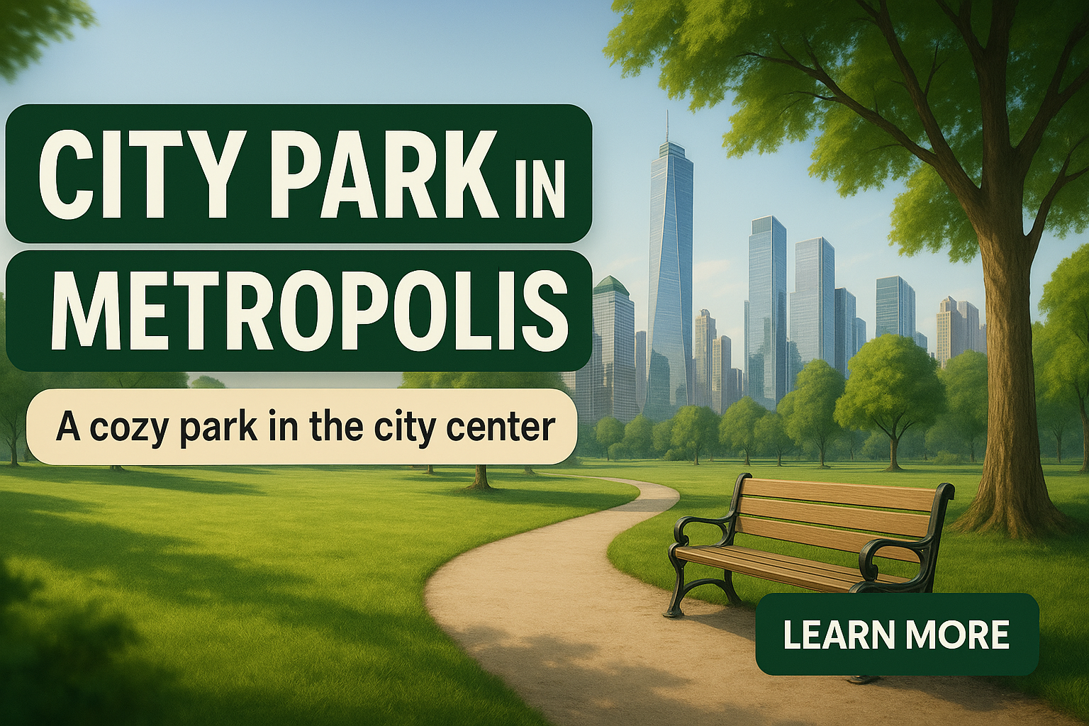 Inviting promotional image showcasing a city park scene with modern skyscrapers in the background. Ideal for urban tourism campaigns and community engagement.