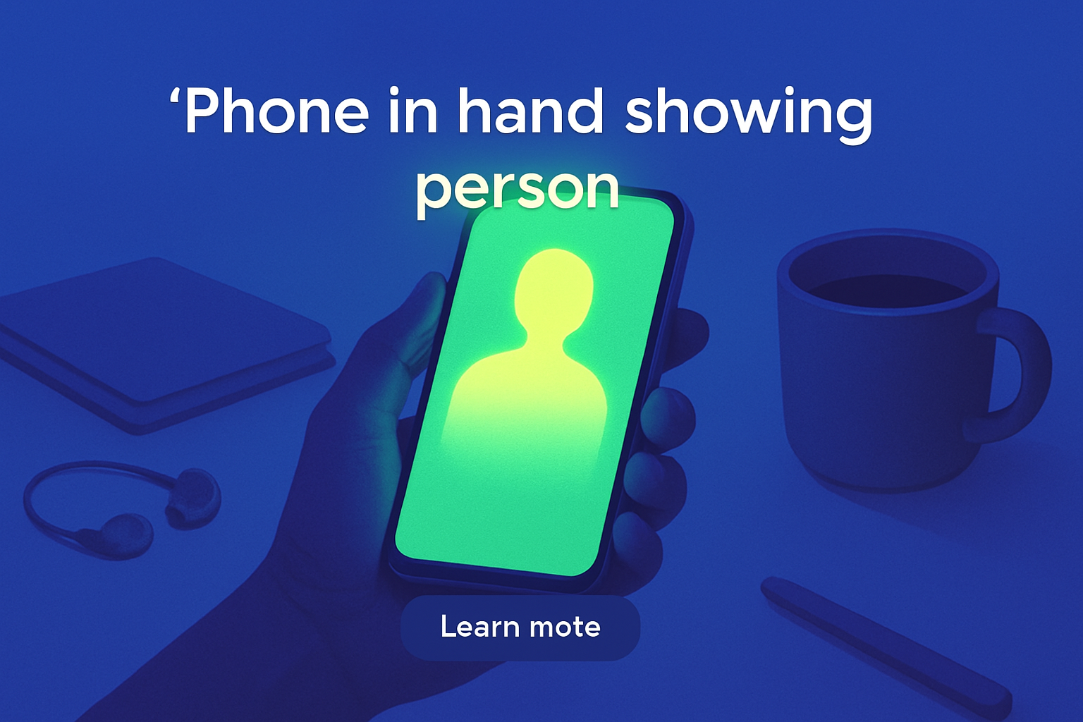 A hand holding a smartphone displaying a glowing silhouette, surrounded by a blue background. The composition features items like a cup and headphones, all in shadow, enhancing the glowing effect.
