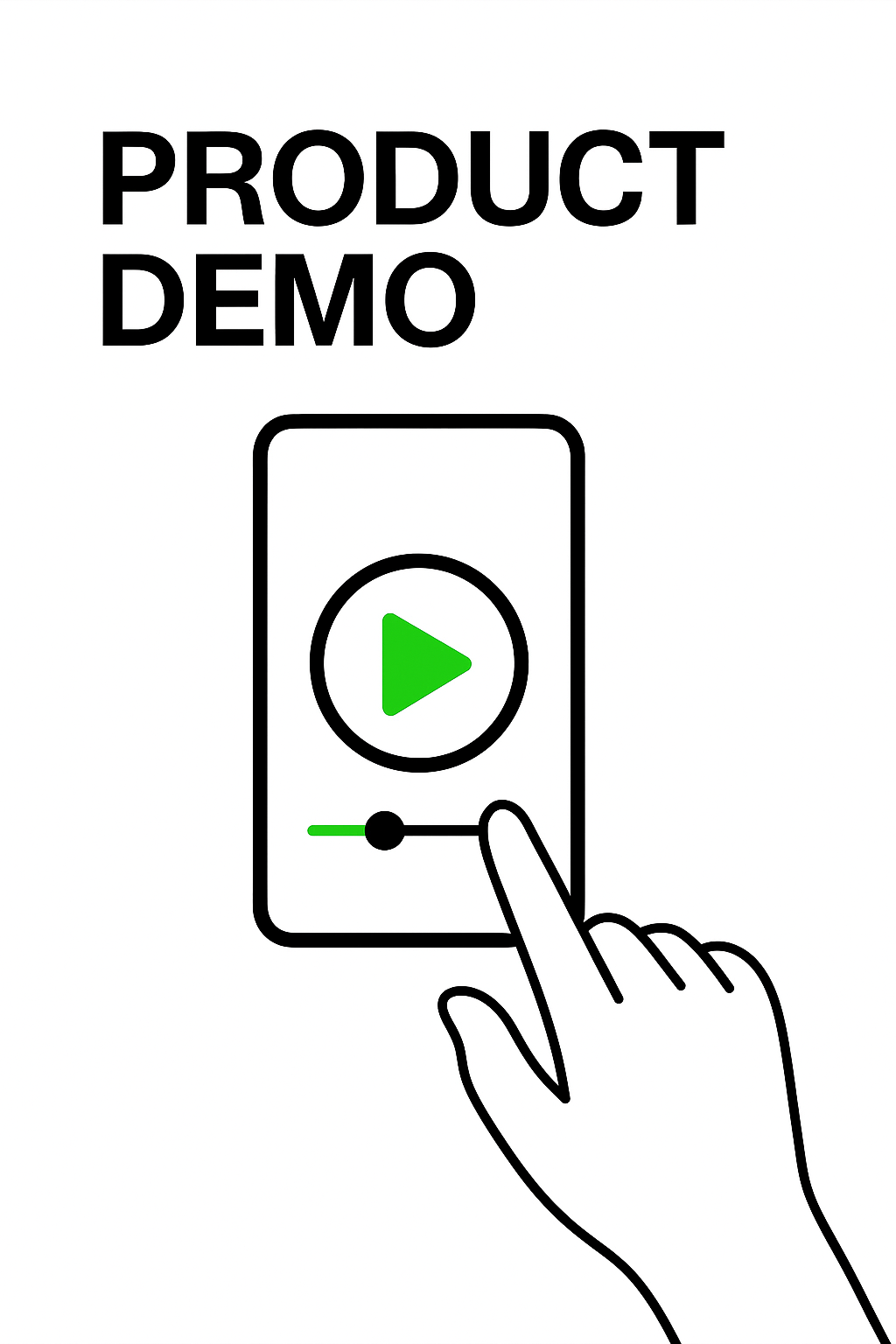 Simple and modern illustration representing a product demo with a hand interacting with a smartphone. Ideal for tech marketing or instructional content.