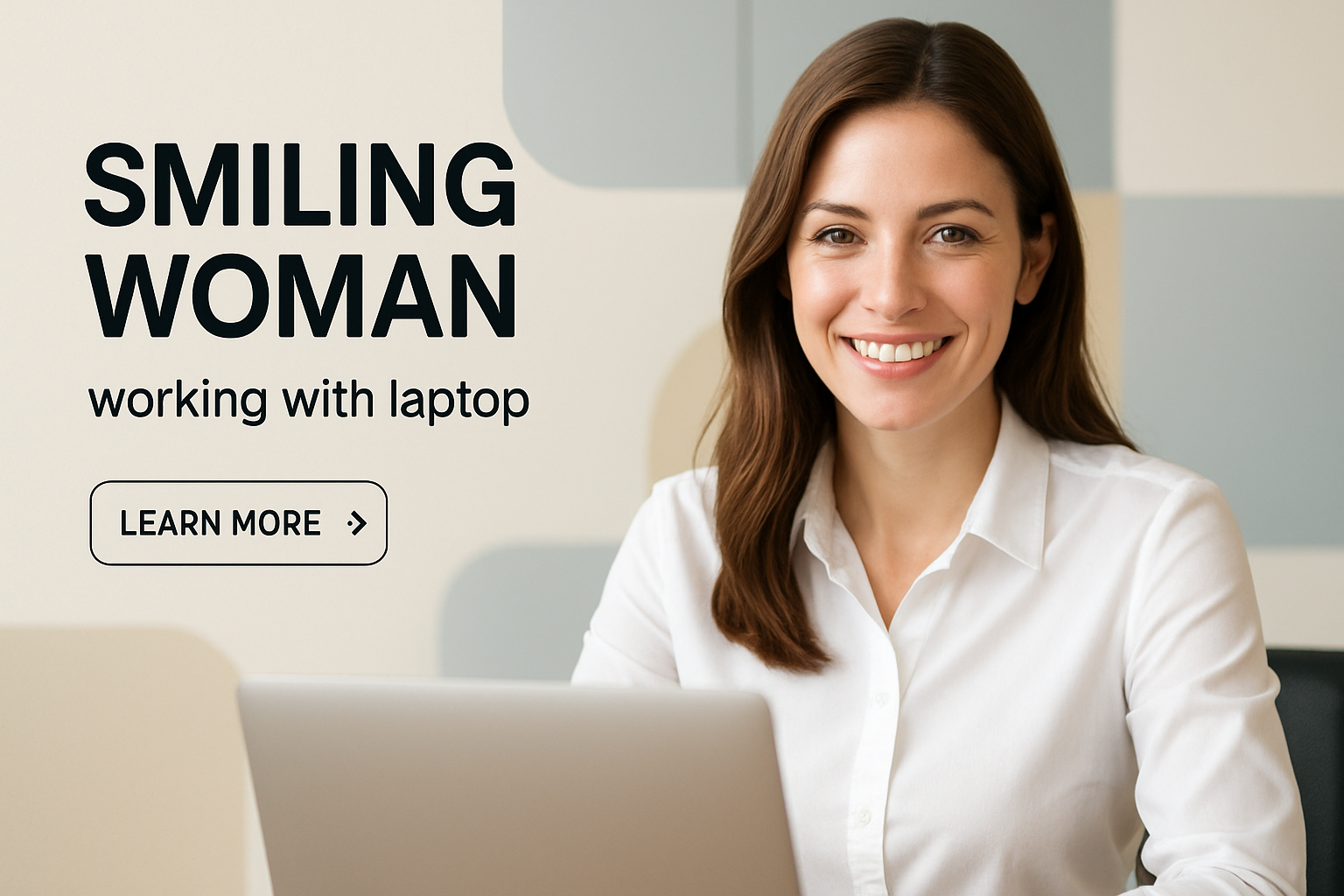 /Collection: /by davooda/Type: PNG/A close-up portrait of a young woman smiling while using a laptop in a modern office setting. The background features geometric shapes in soft colors, enhancing the professional atmosphere.