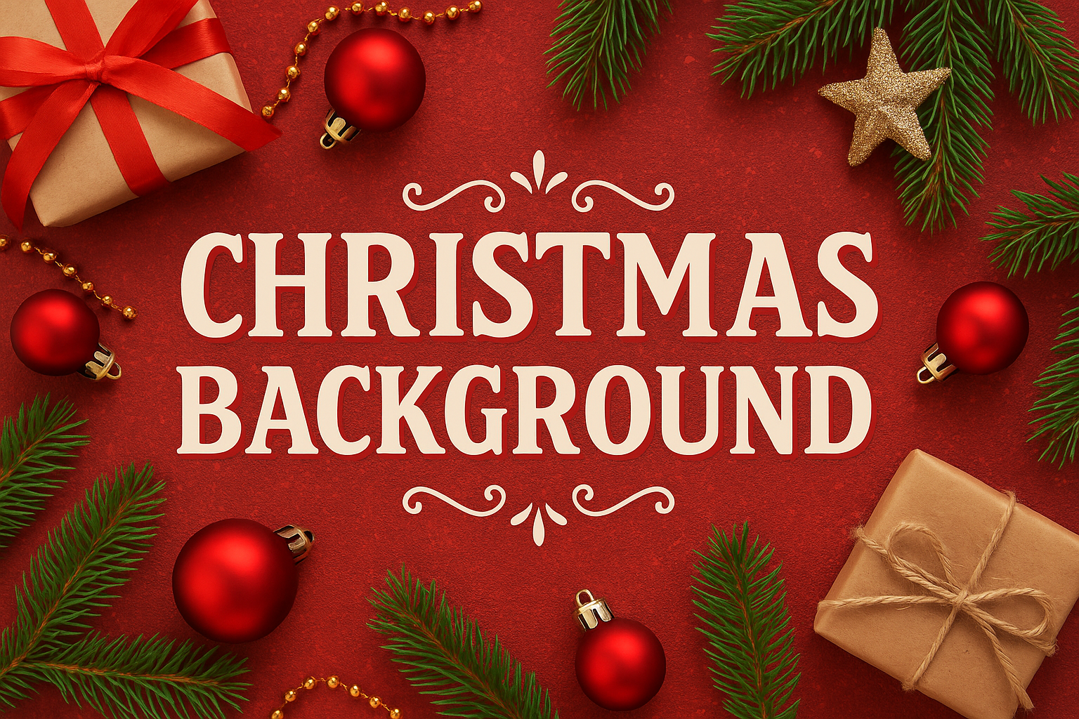 Vibrant Christmas-themed background featuring decorative elements like ornaments, gifts, and greenery, ideal for holiday promotions and seasonal content.