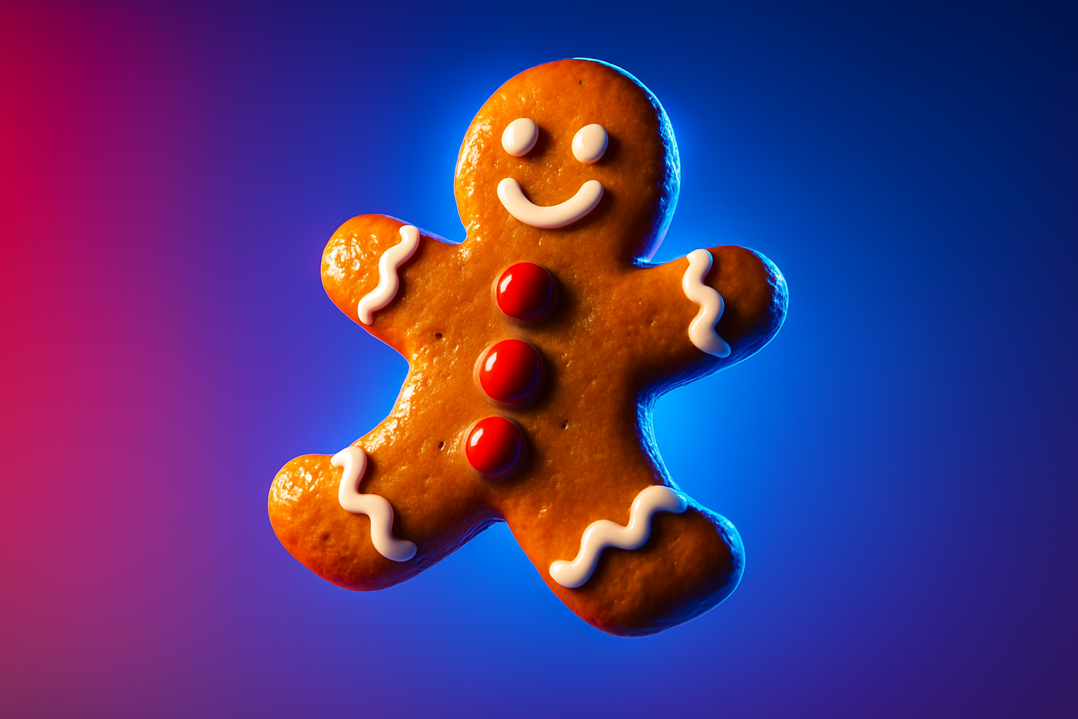 A glossy gingerbread man cookie cutout floats in mid-air, illuminated by contrasting lights from both sides. The vibrant background enhances the festive appearance.