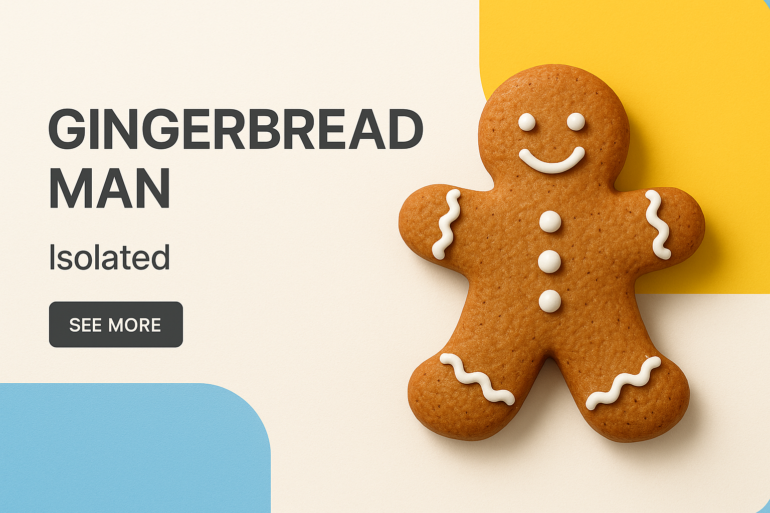 /Collection: /by davooda/Type: PNG/A well-lit gingerbread man stands out against a bright, geometric background. The layout features bold typography, clear hierarchy, and a call-to-action button, exuding a modern and professional style.
