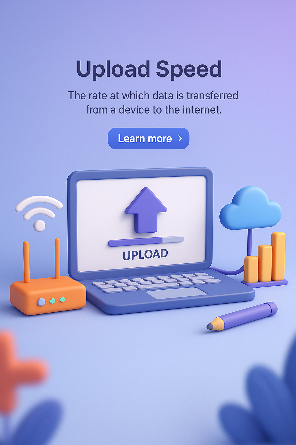 /Collection: /by davooda/Type: PNG/A vibrant 3D illustration showcasing the concept of upload speed. It features a laptop with an upload icon, alongside graphical elements like bars and clouds, set against a gradient background.